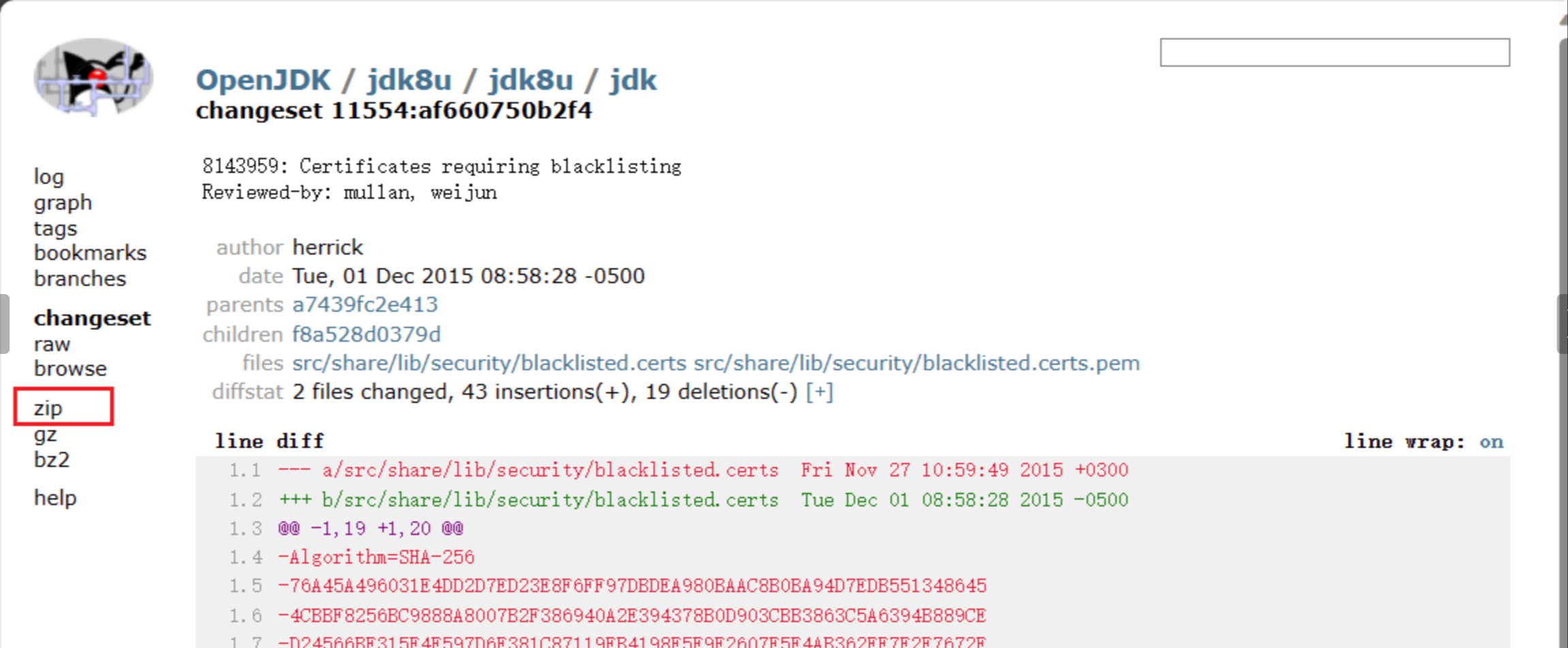 由于涉及到调试 Java 底层源码,因此我们需要下载相应的源码:https://hg.openjdk.org/jdk8u/jdk8u/jdk/rev/af660750b2f4