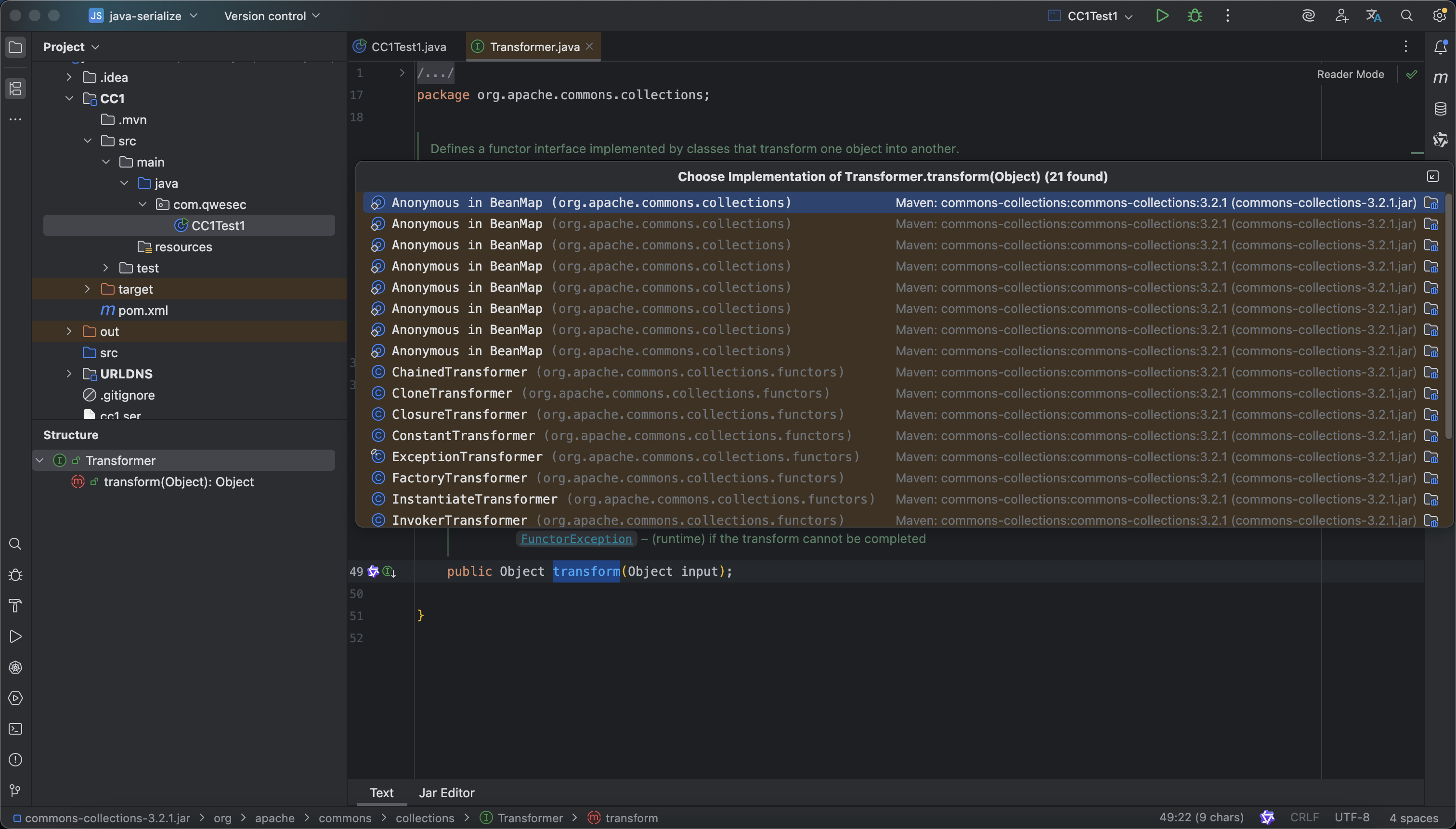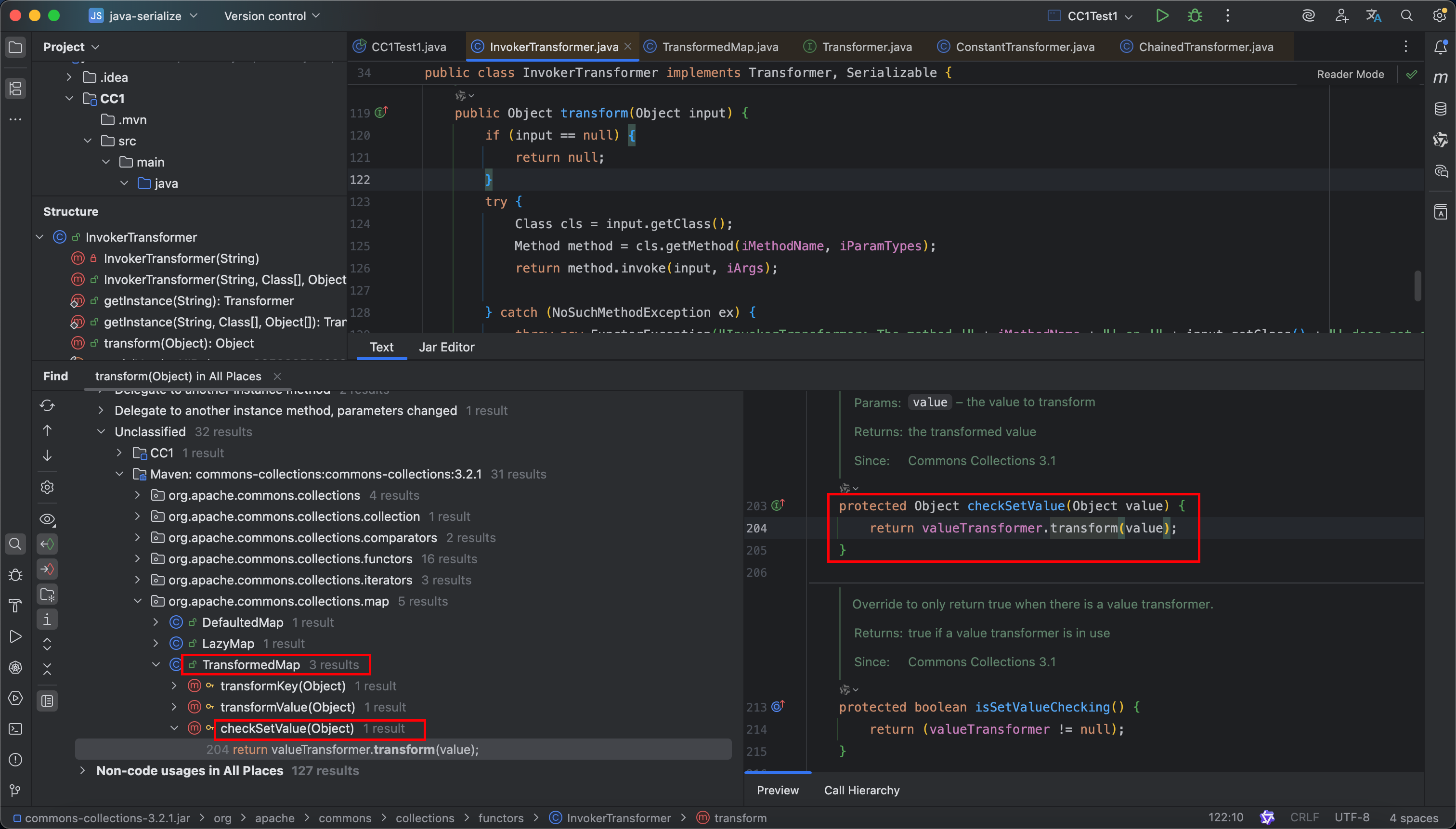 知道了可以通过实例化 InvokerTransformer 类调用 transform 执行命令,那么我们就需要知道哪里调用了 transform 方法。