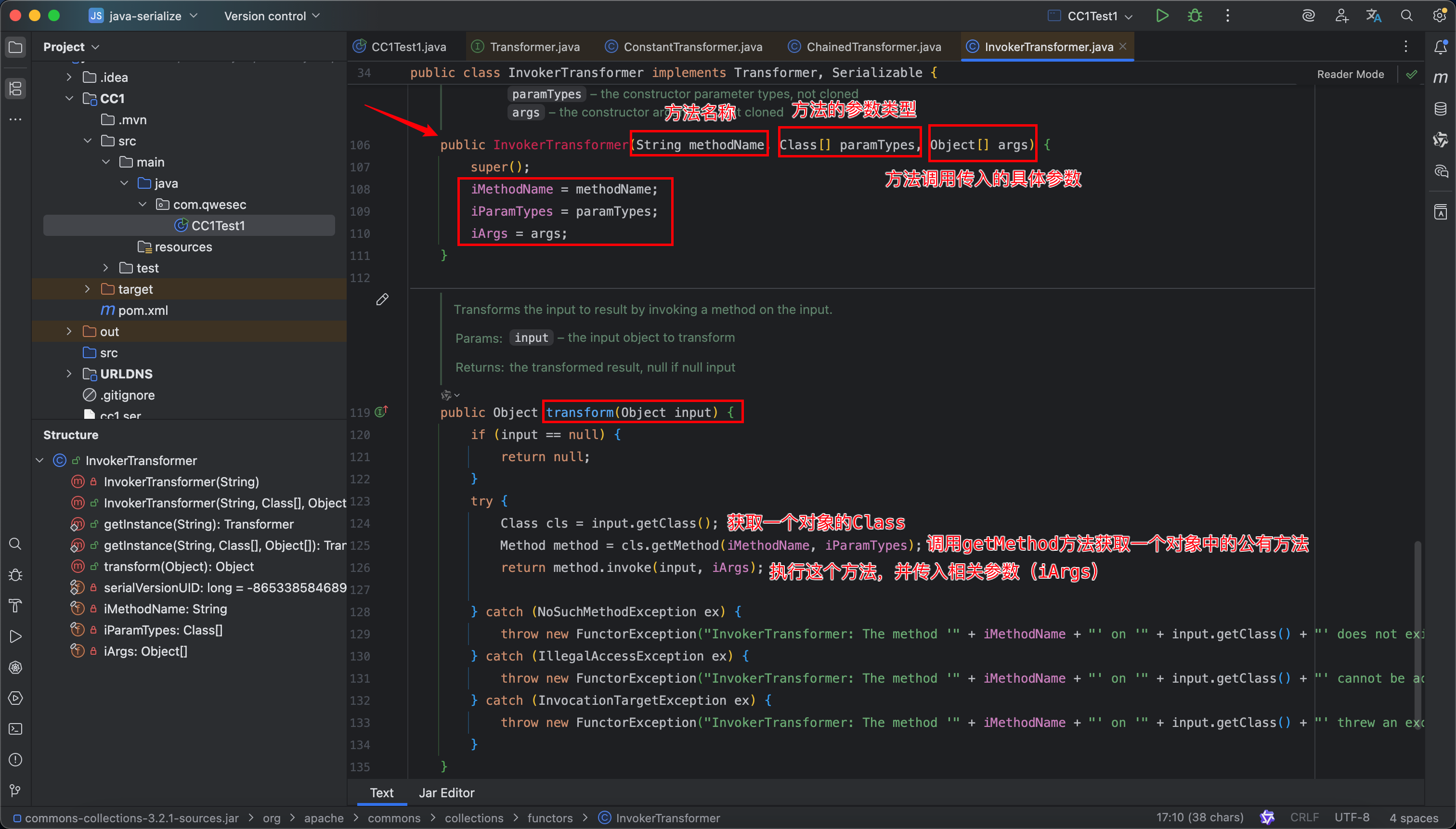 transform 接收一个对象,调用对象的 getClass() 方法获取Class,接着又调用了 getMethod 和 invoke 相关方法。典型的反射操作。