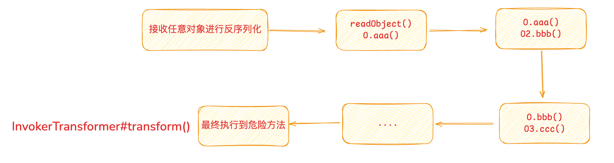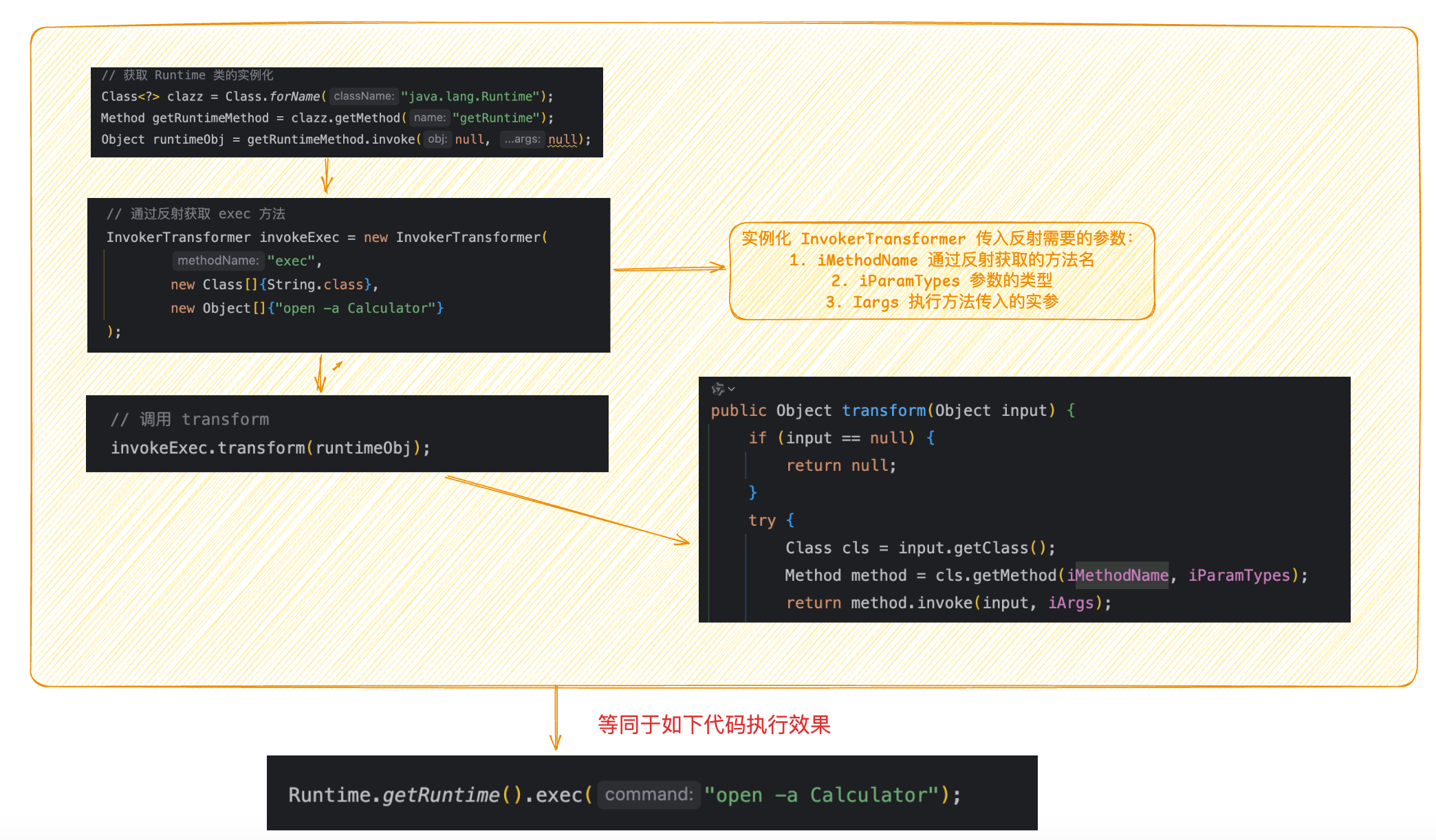 InvokerTransformer依次调用 Method.invoke(...) 和 Runtime.exec(...),最终执行命令。