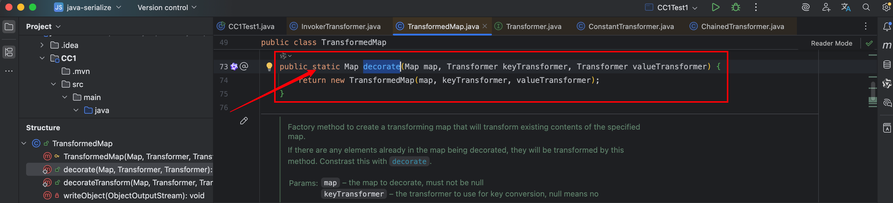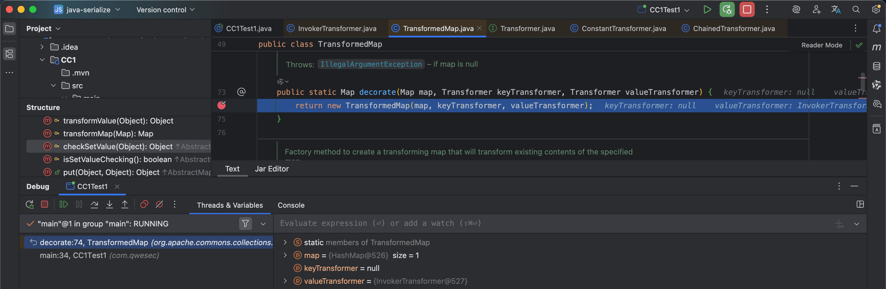 debug 一下就可以发现此时已经调用了 decorate 方法间接的调用了 TransformedMap 的受保护的构造器方法为 map 和 valueTransformer 属性进行赋值。