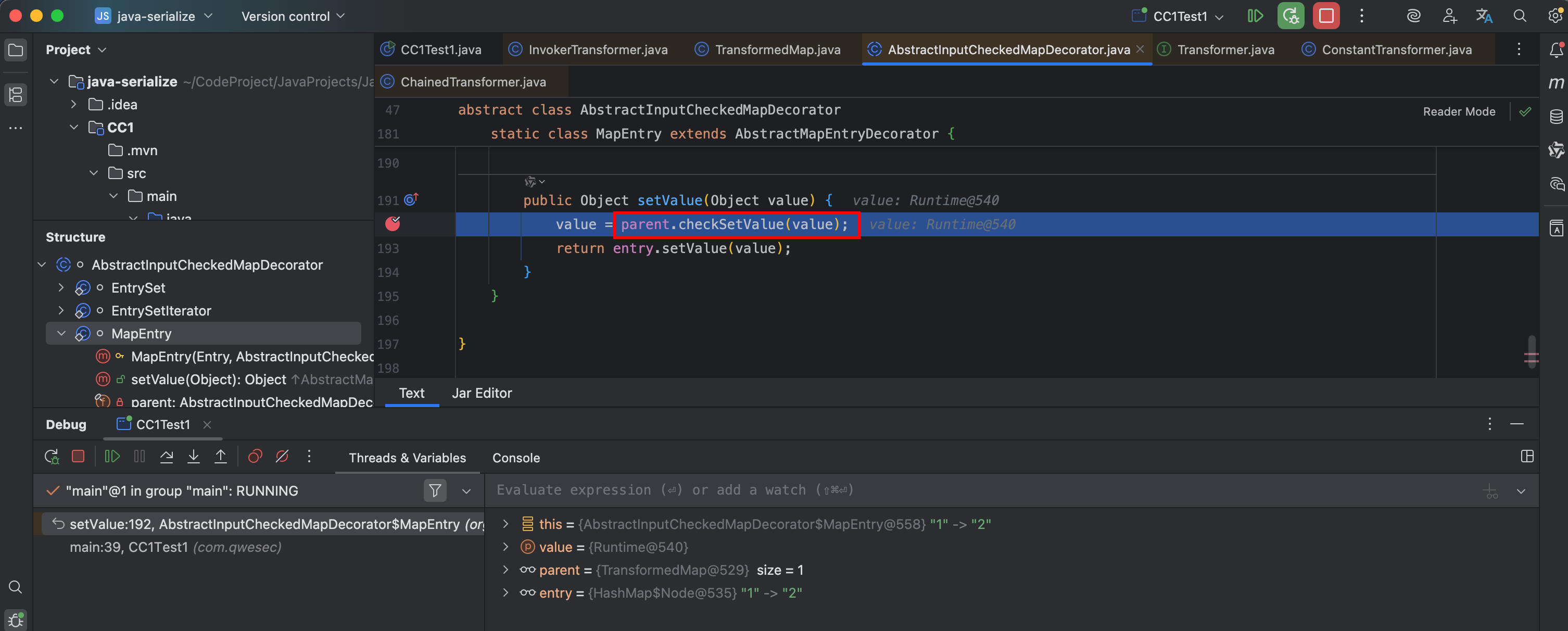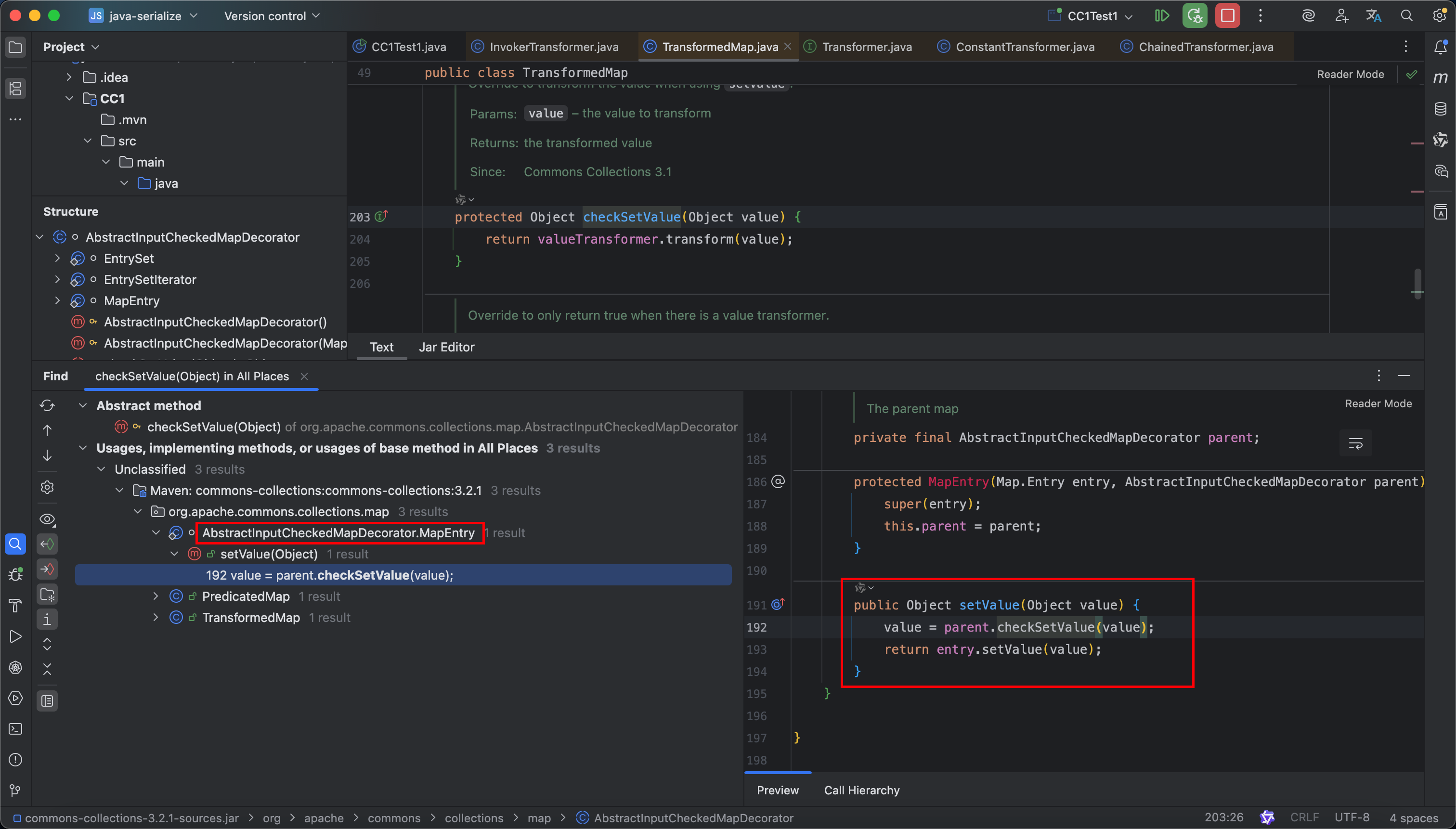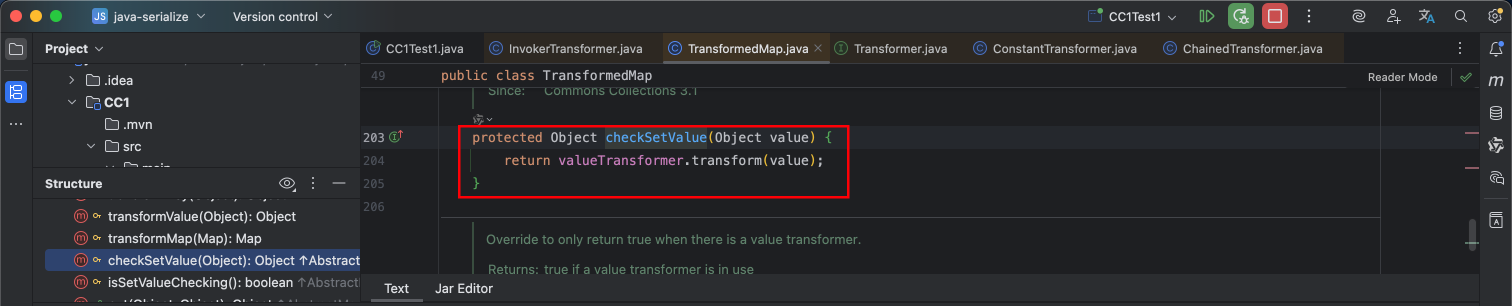 发现在 transformedMap#checkSetValue方法调用了 transform,并且 transform 的形参为一个对象类型。