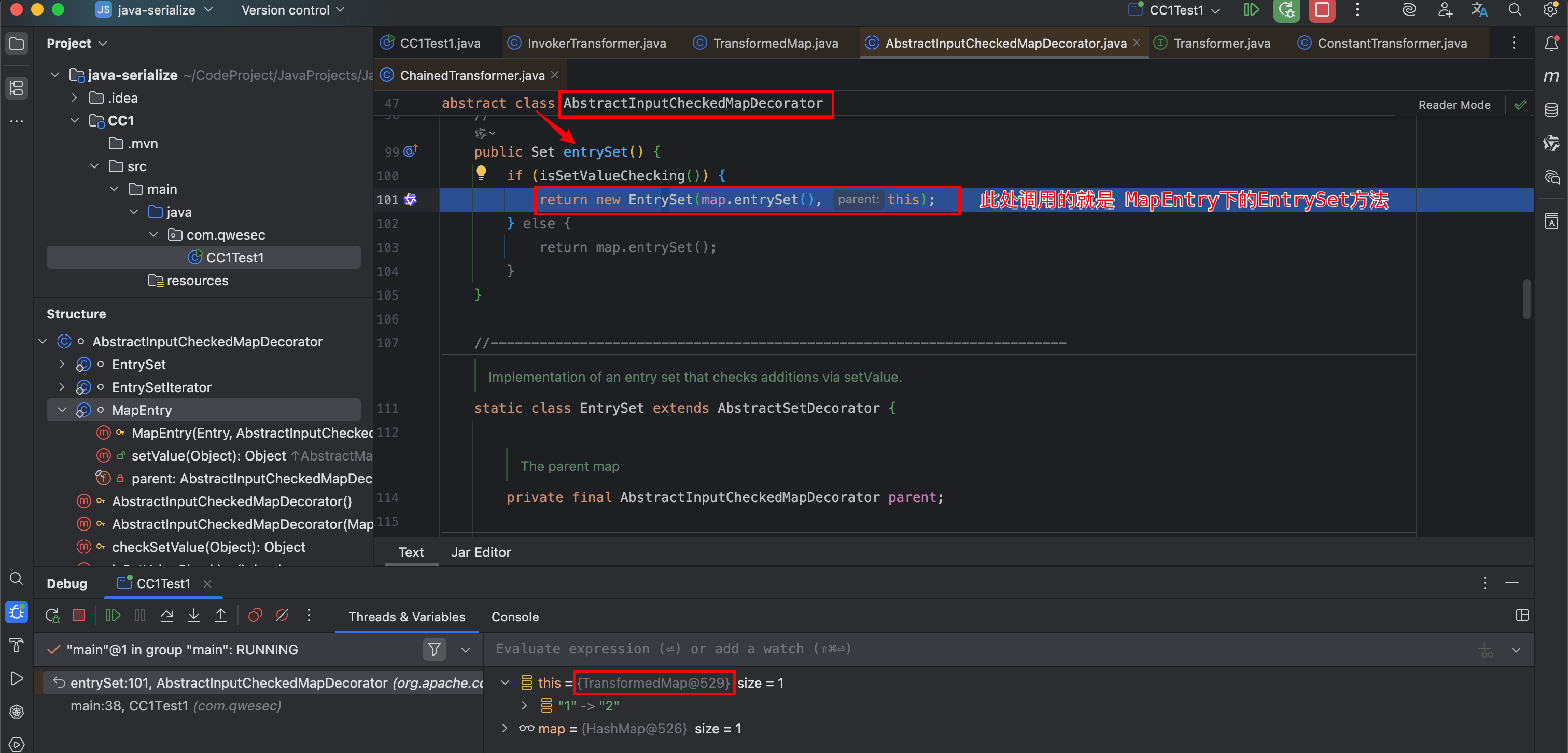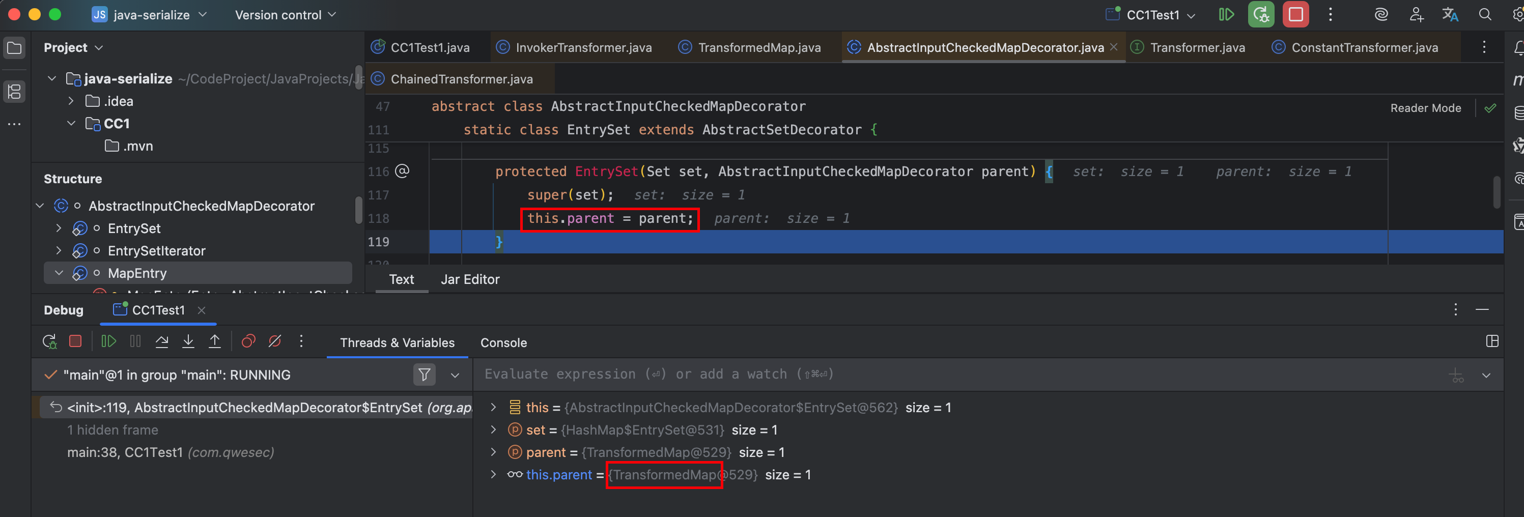 其实 TransformedMap 类继承自 AbstractInputCheckedMapDecorator,而 TransformedMap 类本身是没有 entrySet 方法的,而是调用的是父类的 entrySet 方法。