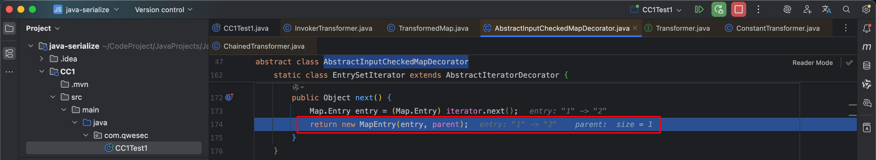 本质上 transformedMapDecorate.entrySet()其实调用的是其父类 AbstractInputCheckedMapDecorator 的 entrySet,经过上述分析,一顿初始化操作之后,就会执行到迭代器的方法 next() 方法。此处才是真正的实例化了 MapEntry。而 parent 的值还是 TransformedMap。