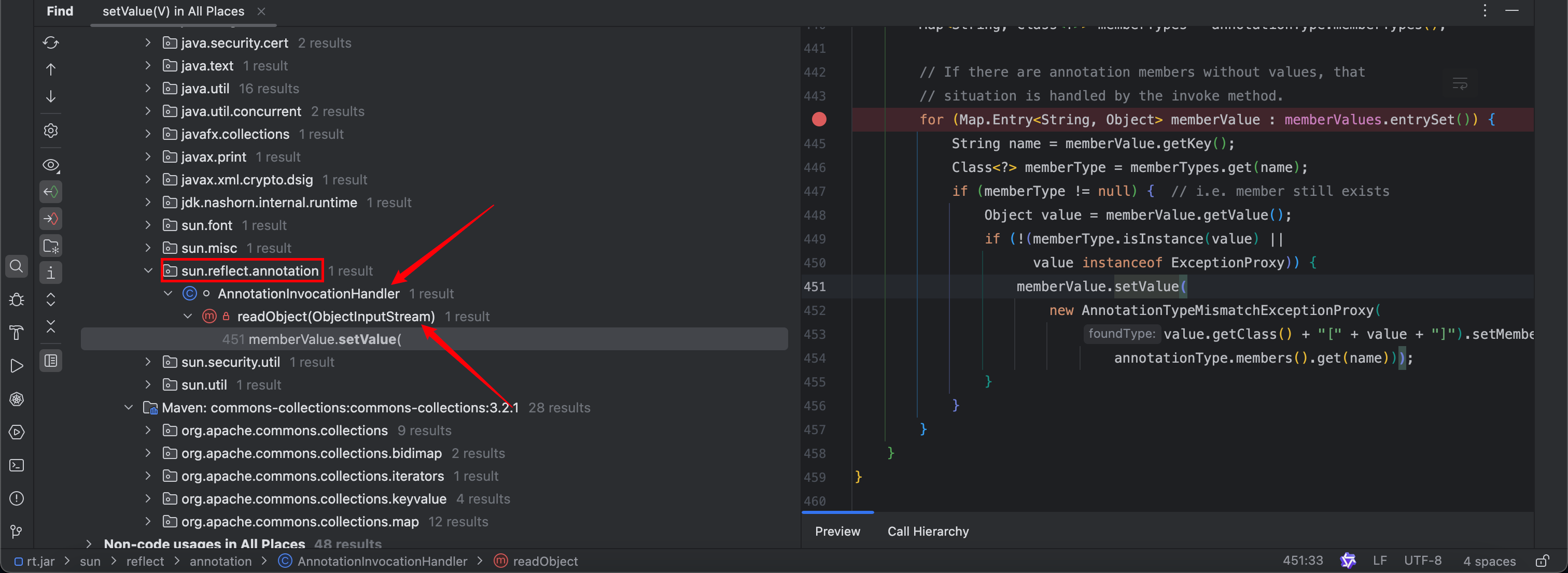 在 jdk8u65 的源码中 sun.reflection.annotation.AnnotationInvocationHandler 类中就存在如上场景,恰巧的是,刚好在 readObject 方法当中,因此我们的目标很明确,反序列化该类。