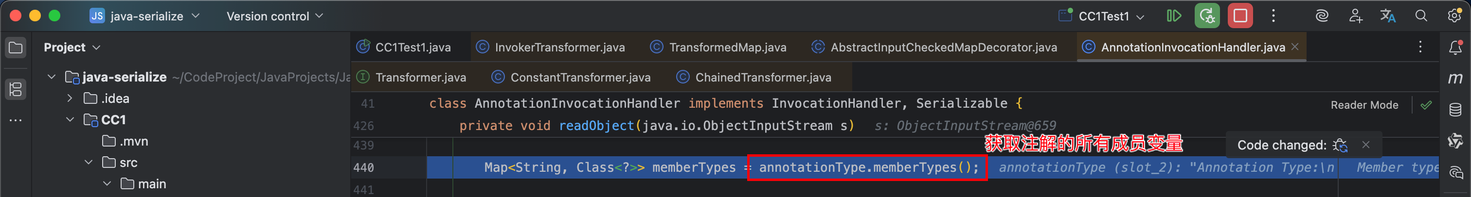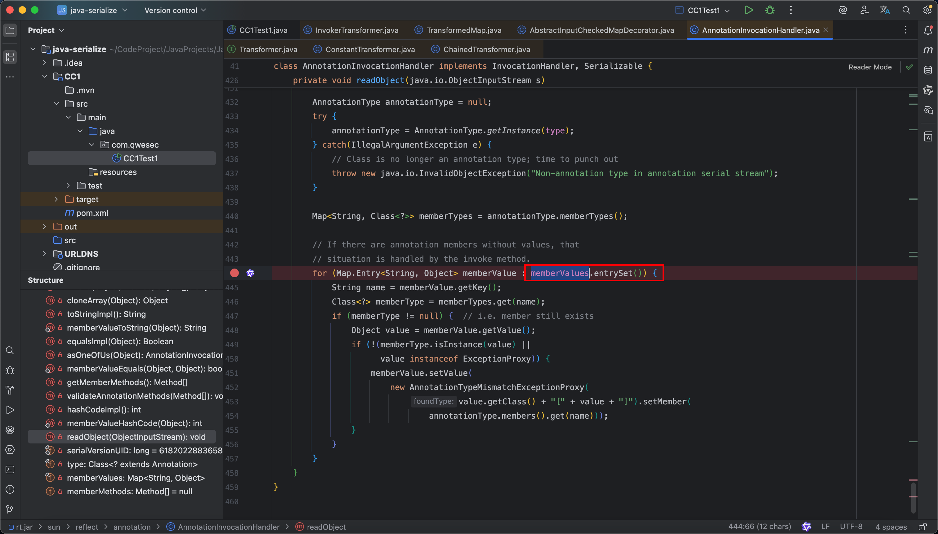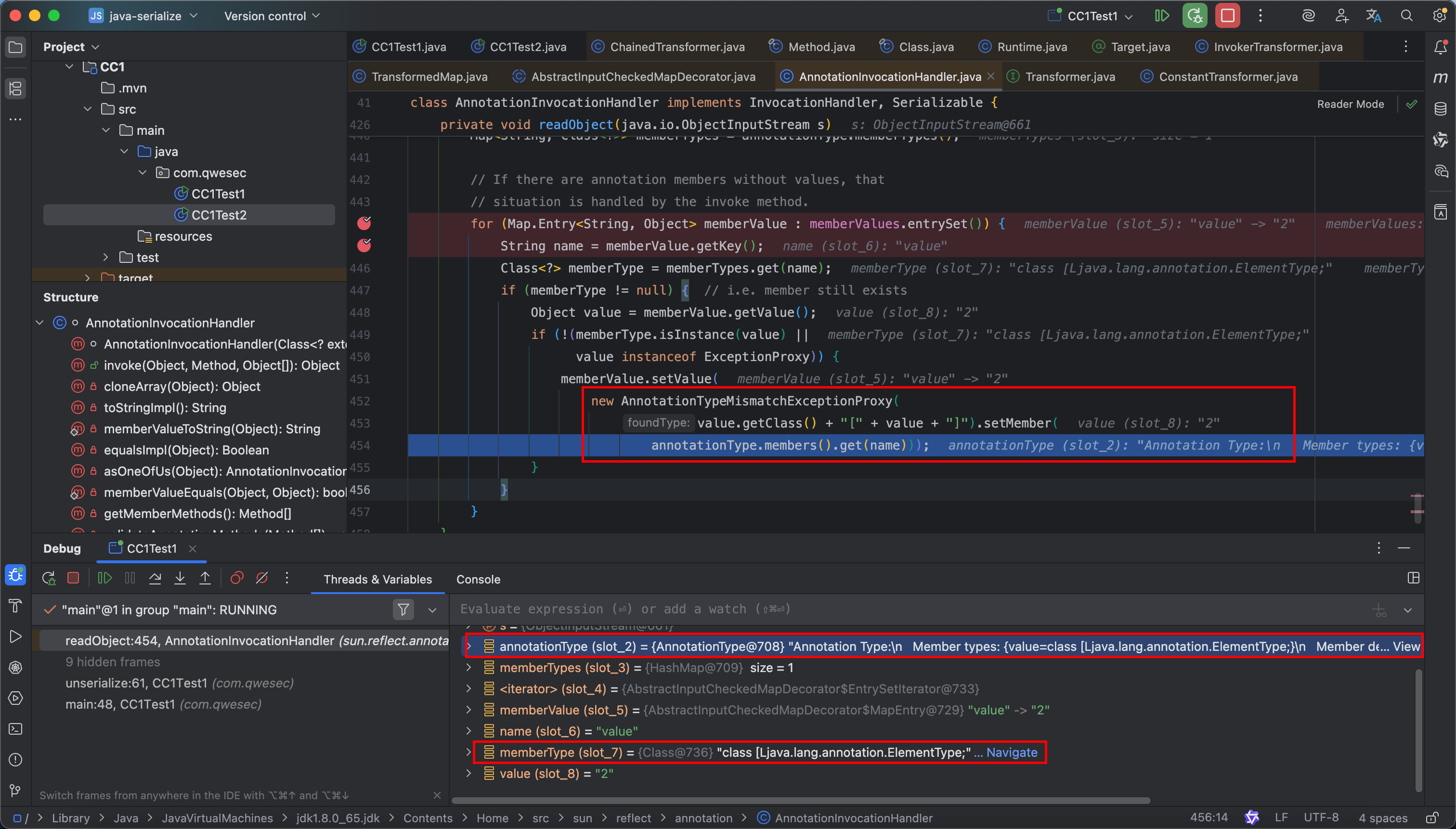 | public class CC1Test1 { public static void main(String[] args) throws ClassNotFoundException, NoSuchMethodException, InvocationTargetException, IllegalAccessException, IOException, InstantiationException {