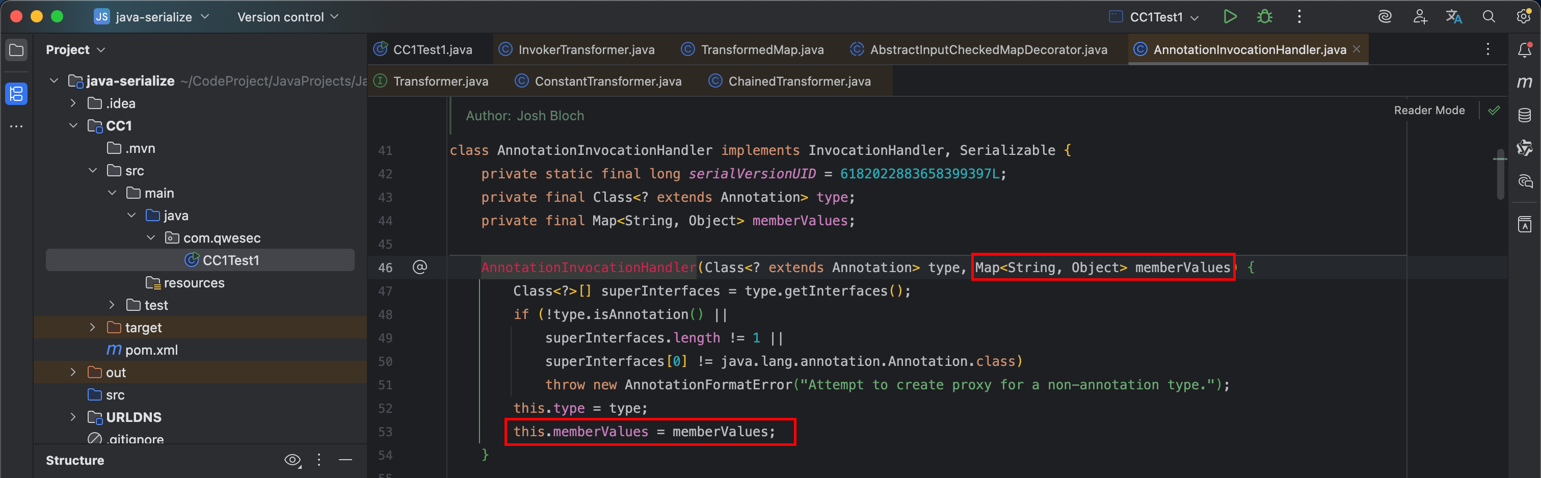 我们来找一下 memberValues 属性的赋值部分,发现在该类中的构造器赋值,但是修饰符是默认的,不能被外部调用,故而只能通过反射进行调用构造器获取对象。