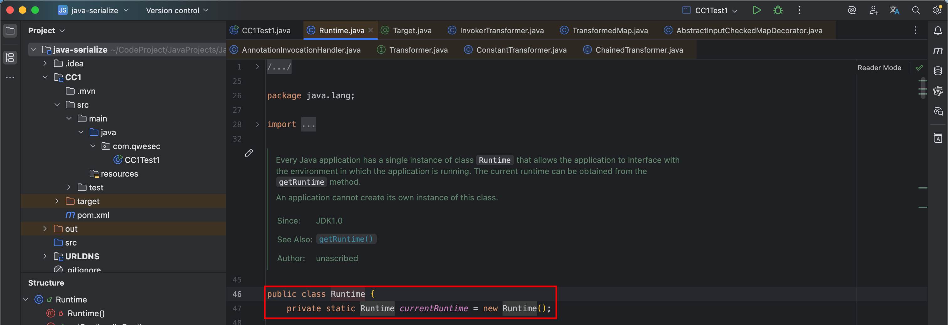 | public class CC1Test1 { public static void main(String[] args) throws ClassNotFoundException, NoSuchMethodException, InvocationTargetException, IllegalAccessException { Class<?> clazz = Class.forName("java.lang.Runtime"); Method getRuntimeMethod = clazz.getMethod("getRuntime"); Object runtimeObj = getRuntimeMethod.invoke(null, null);
