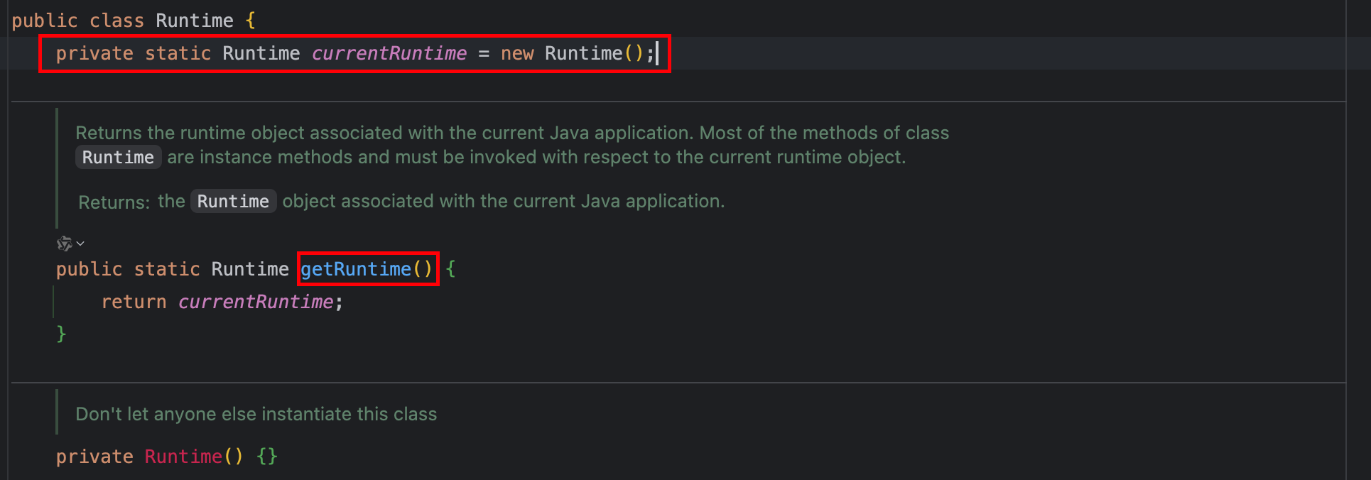 这里我们怎么获取 Runtime 类的实例化对象呢?我们来看下 Runtime 类的定义,这里将构造器私有化, 留出一个静态方法 getRuntime() 进行获取对象,确保 Runtime 始终只有一个对象,也就是单例模式。
