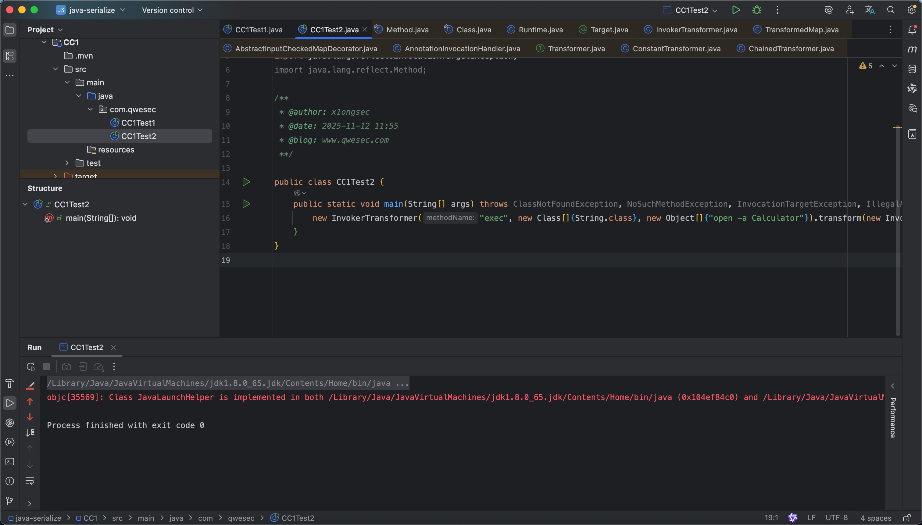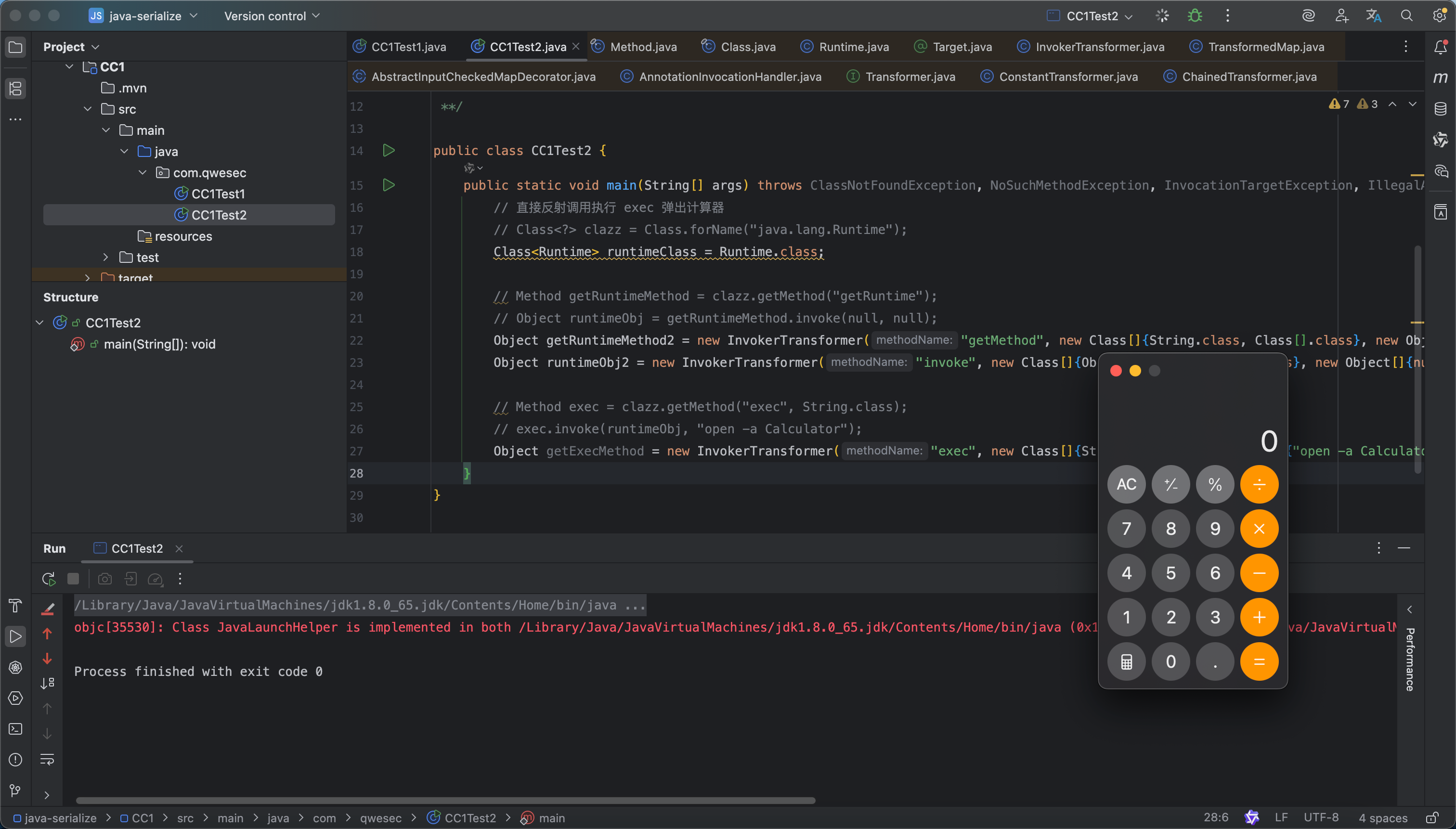 | public class CC1Test2 { public static void main(String[] args) throws ClassNotFoundException, NoSuchMethodException, InvocationTargetException, IllegalAccessException { Class<?> clazz = Class.forName("java.lang.Runtime"); Method getRuntimeMethod = clazz.getMethod("getRuntime"); Object runtimeObj = getRuntimeMethod.invoke(null, null); Method exec = clazz.getMethod("exec", String.class); exec.invoke(runtimeObj, "open -a Calculator"); } }