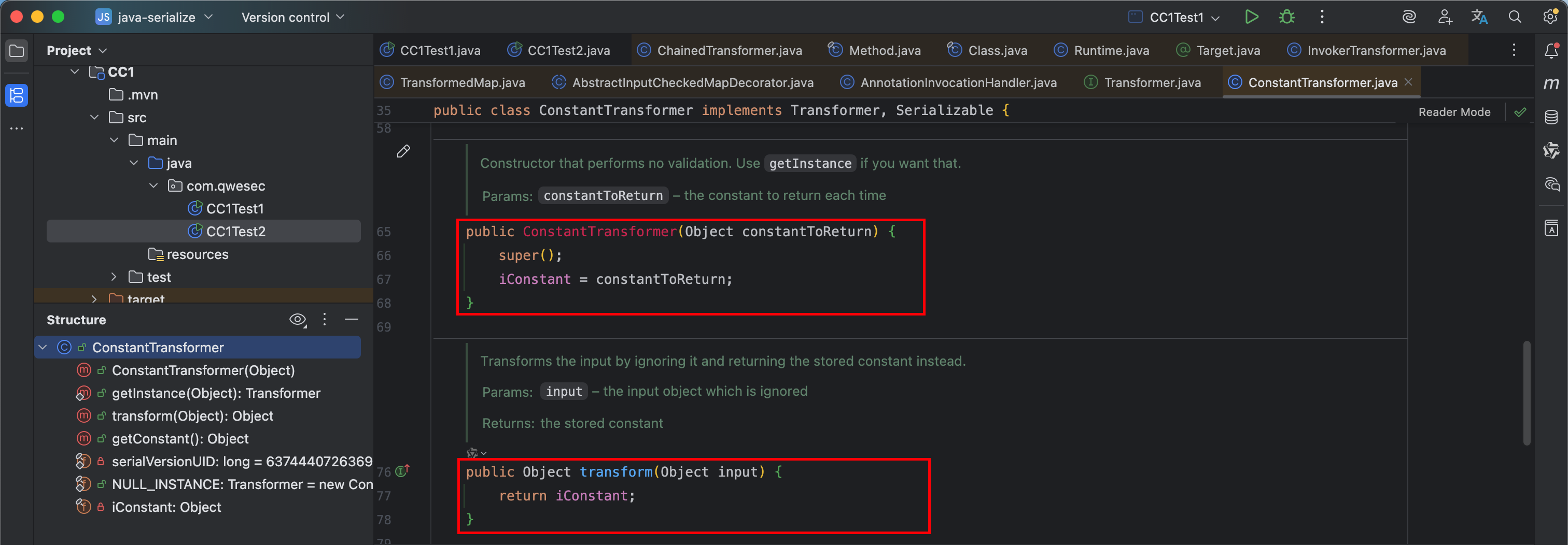 这里来看 ConstantTransformer 类,有这么一个 transform 方法,无论你给他传入什么,最终返回的都是 iConstant。并且 iConstant 这个值我们可以通过该类的构造器进行控制。