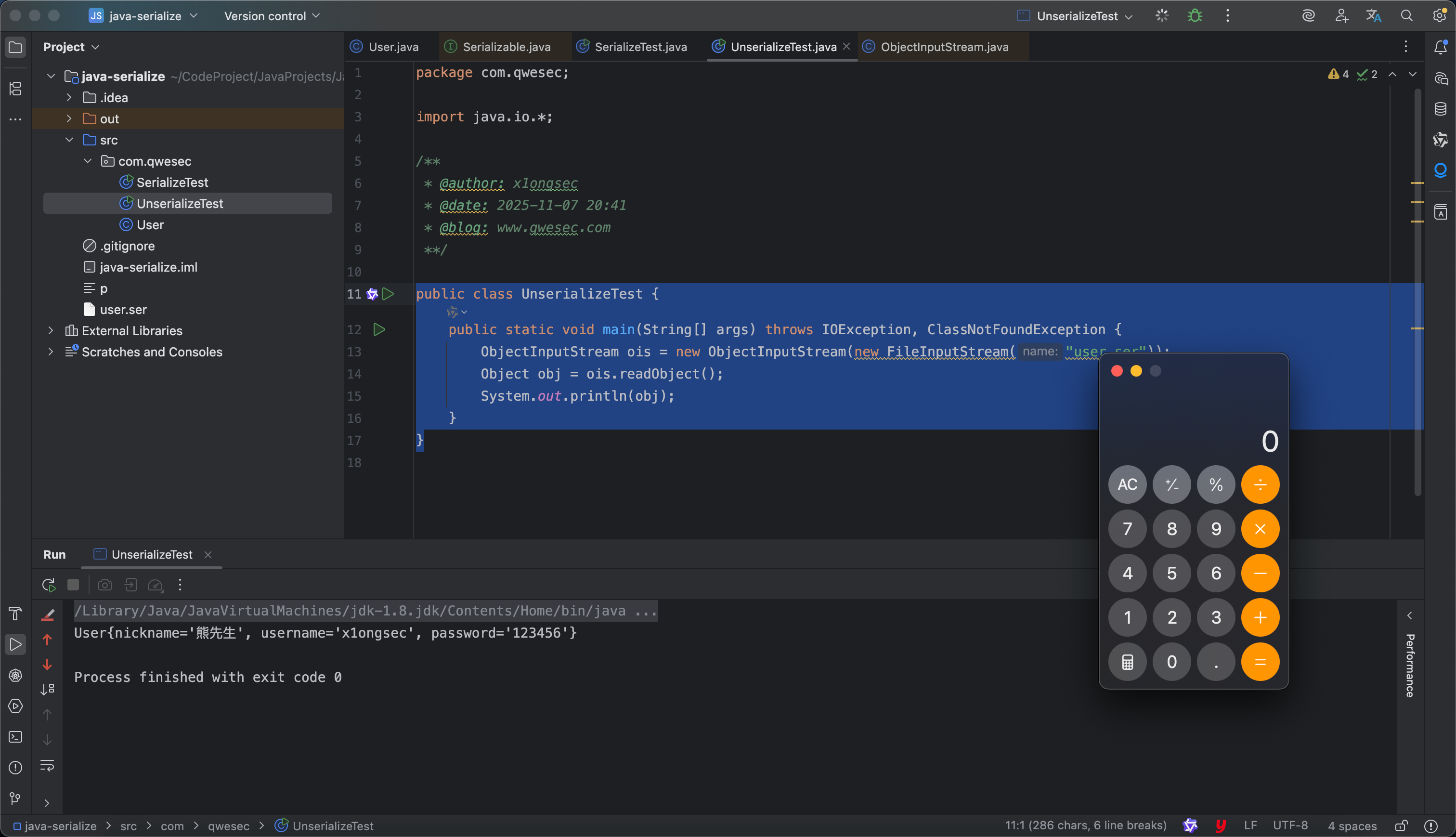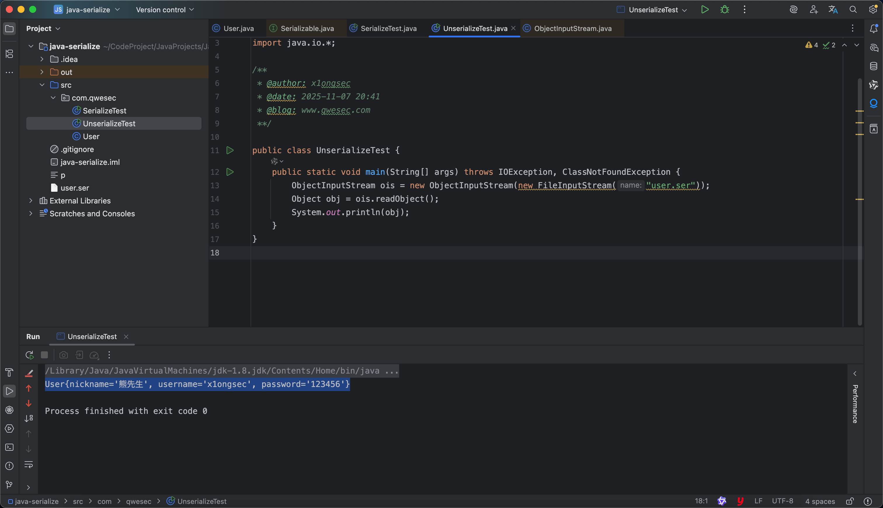 先对 User 类序列化获得相应的序列化二进制文件,接着进行反序列化。