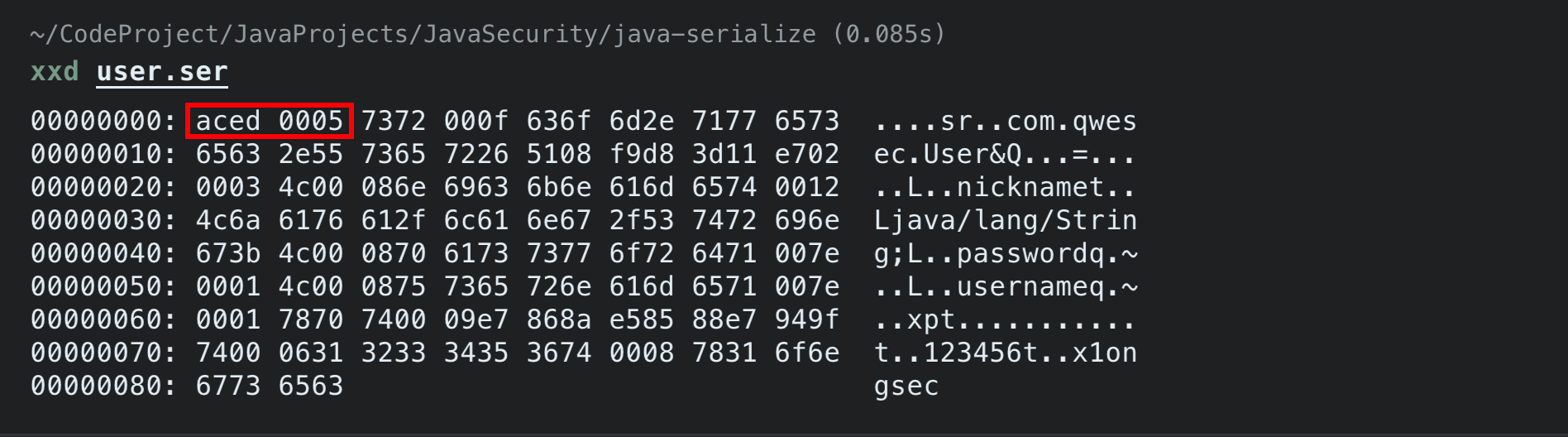 Java 序列化数据通常以 AC ED 00 05开头,其中 AC ED表示是 Java序列化文件的专属标识,00 05则表示序列化协议的版本号。