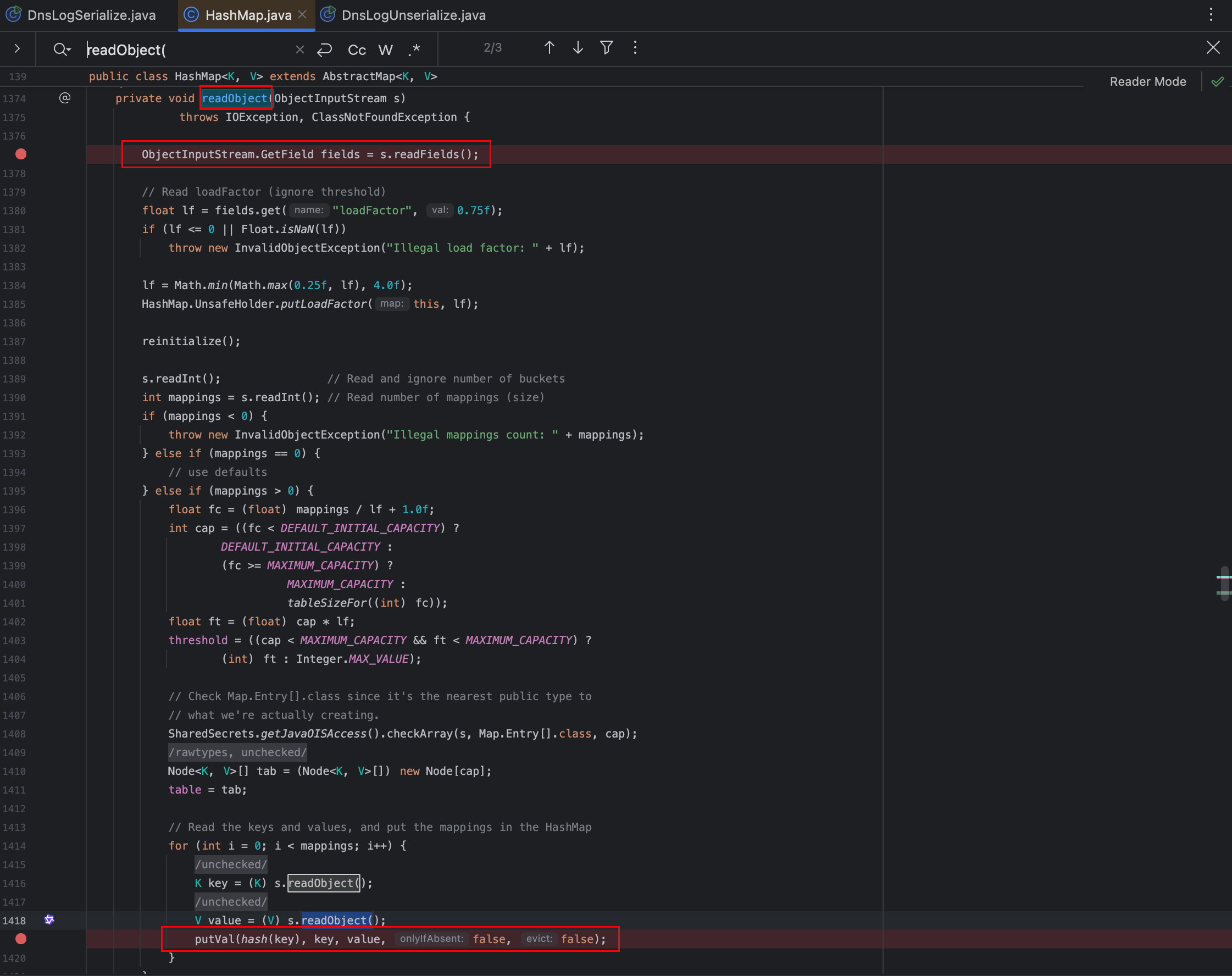 /** * A blog post with more details about this gadget chain is at the url below: * https://blog.paranoidsoftware.com/triggering-a-dns-lookup-using-java-deserialization/ * * This was inspired by Philippe Arteau @h3xstream, who wrote a blog * posting describing how he modified the Java Commons Collections gadget * in ysoserial to open a URL. This takes the same idea, but eliminates * the dependency on Commons Collections and does a DNS lookup with just * standard JDK classes. * * The Java URL class has an interesting property on its equals and * hashCode methods. The URL class will, as a side effect, do a DNS lookup * during a comparison (either equals or hashCode). * * As part of deserialization, HashMap calls hashCode on each key that it * deserializes, so using a Java URL object as a serialized key allows * it to trigger a DNS lookup. * * Gadget Chain: * HashMap.readObject() * HashMap.putVal() * HashMap.hash() * URL.hashCode() * * */ @SuppressWarnings({ "rawtypes", "unchecked" }) @PayloadTest(skip = "true") @Dependencies() @Authors({ Authors.GEBL }) publicclassURLDNSimplementsObjectPayload<Object> {